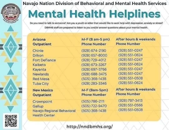 Do you need to talk to someone? Are you a youth or elder seeking help with depression, anxiety or stress? The mental health staff at the Navajo Nation Division of Behavioral and Mental Health Services are prepared to listen to you.
