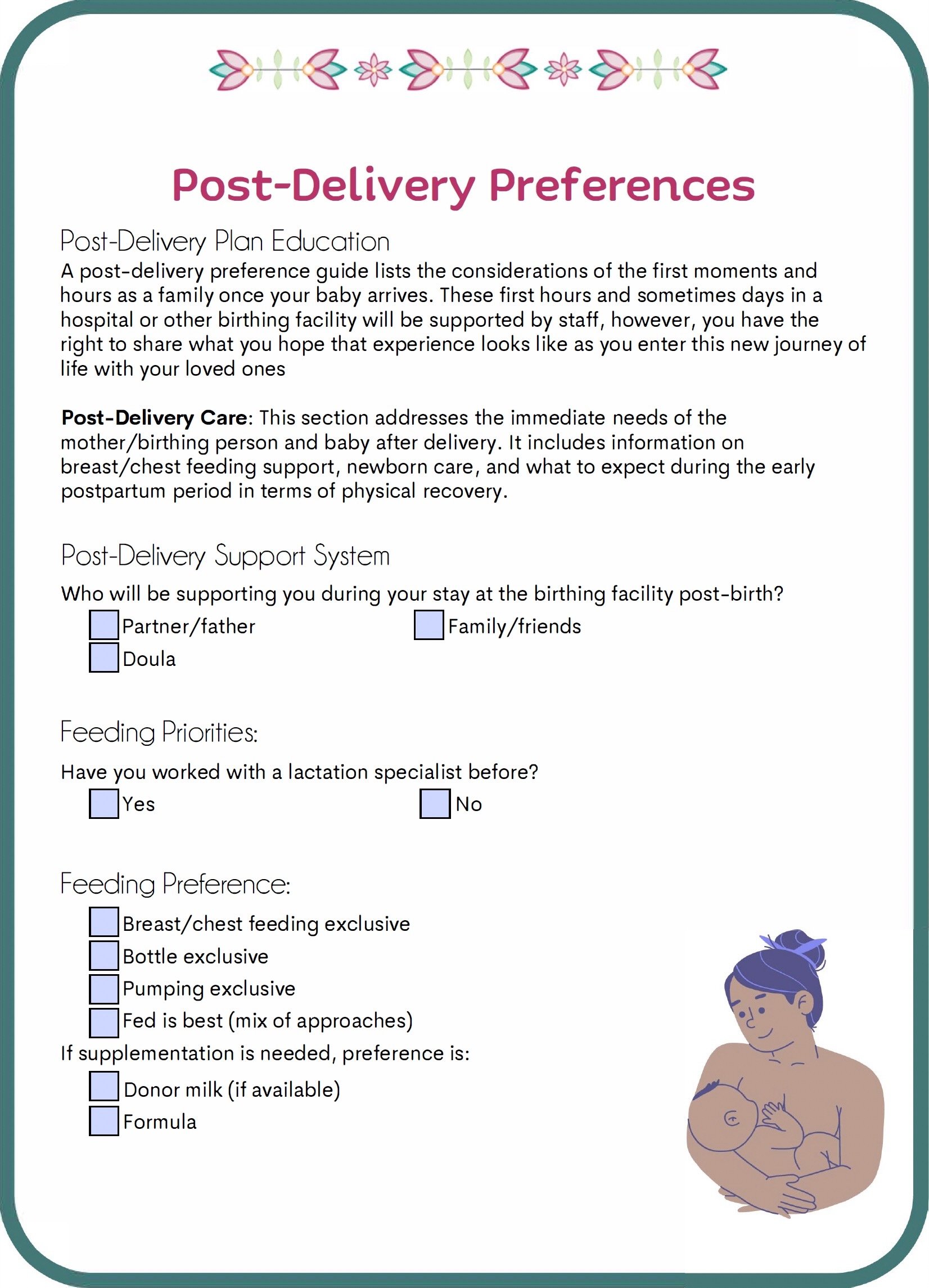 A post-delivery preference guide lists the considerations of the first moments and hours as a family once your baby arrives. These first hours and sometimes days in a hospital or other birthing facility will be supported by staff, however, you have the right to share what you hope that experience looks like as you enter this new journey oflife with your loved ones.