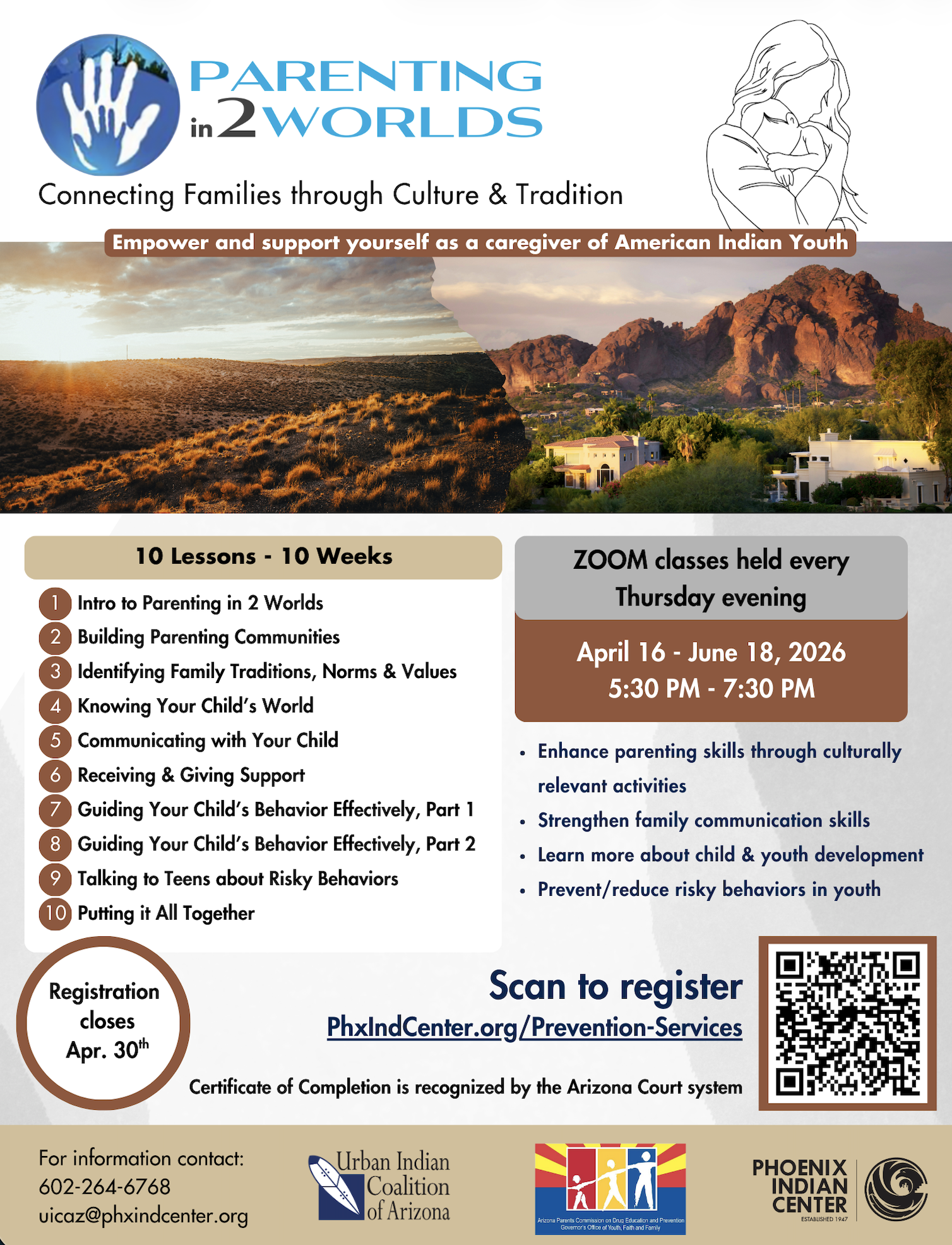 Registration open until April 30, 2026. Zoom classes held April 16-June 18, 2026 5:30-7:30pm Phoenix time