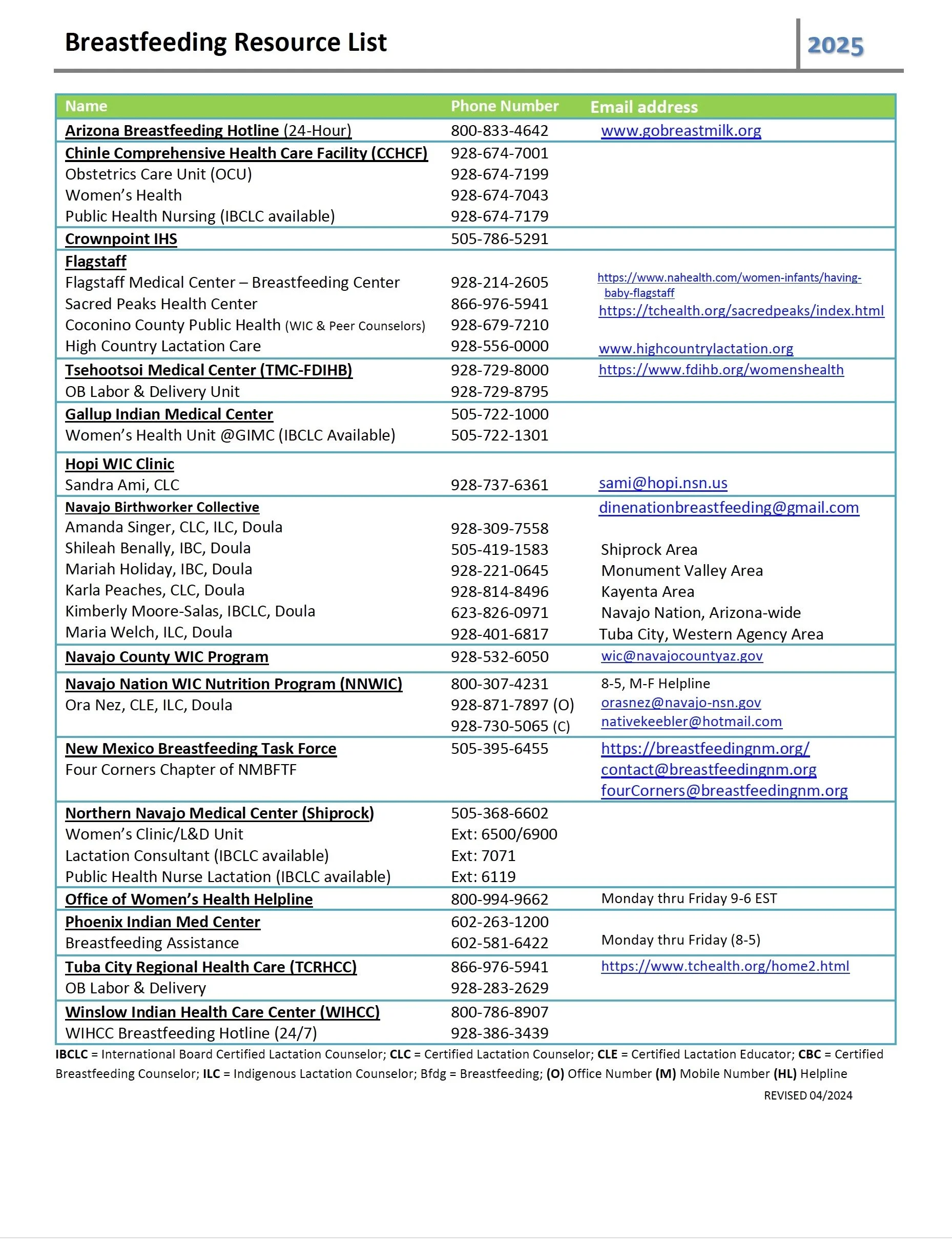 The Breastfeeding Resource List is a comprehensive resource that includes hospitals, clinics, organizations, and birthworkers engaged in supporting breastfeeding, with locations on or near Navajo Nation. The list also includes a 24-hour Hotline. Contact information, including phone numbers and email addresses, is provided on this 1-page document.