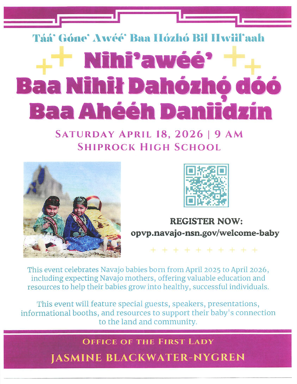 This is an event for Navajo babies born from April 2025 to April 2026 including pregnant Navajo moms. Special guests, speakers, presentations, informational booths, and resources.