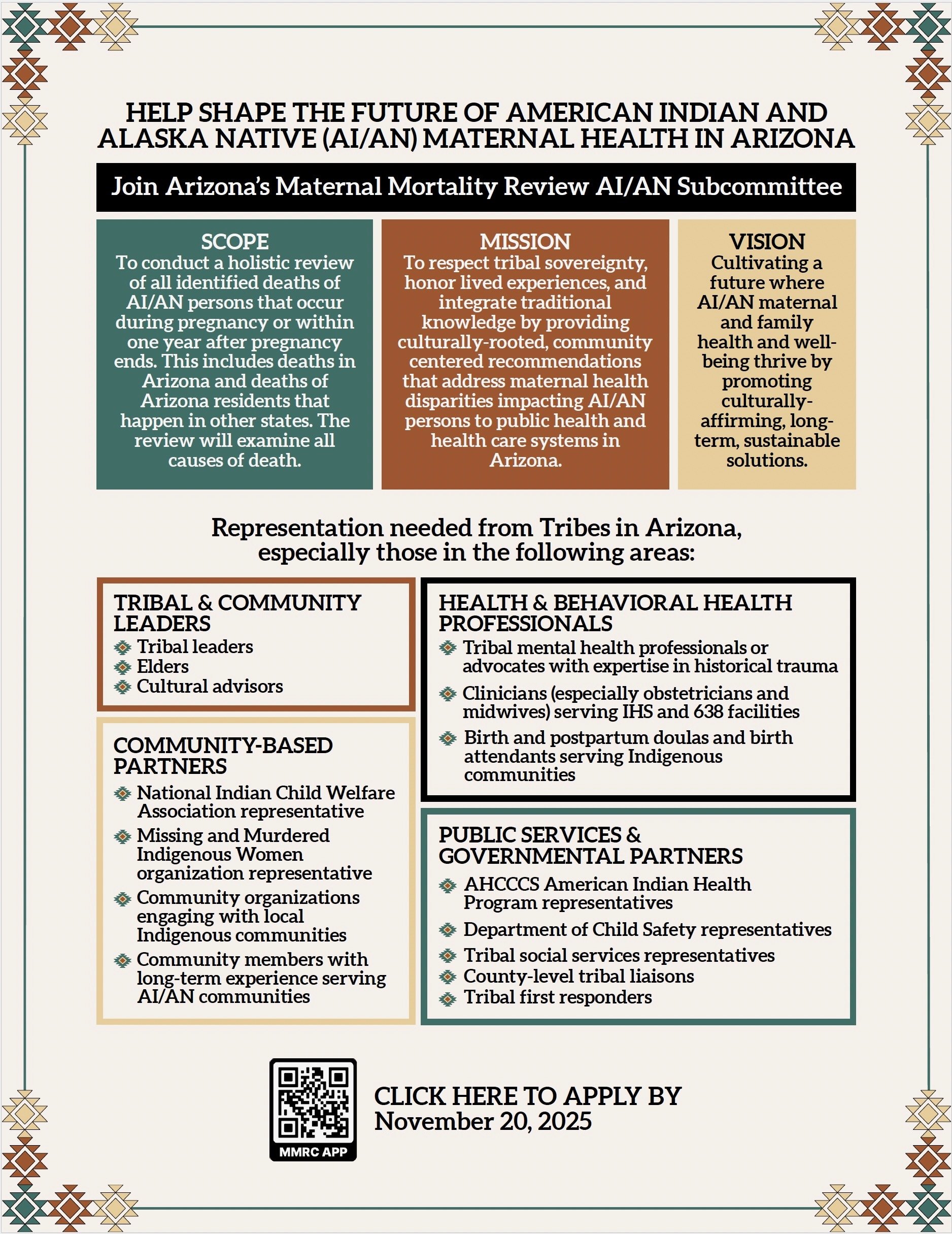 Join Arizona’s Maternal Mortality Review AI/AN Subcommittee. Representation needed from Tribes in Arizona in several areas.